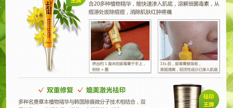 痘印修復(fù)精華 30ml/ 瓶;痘坑修復(fù)精華 30/瓶 ;拔毒膏 20g/支
