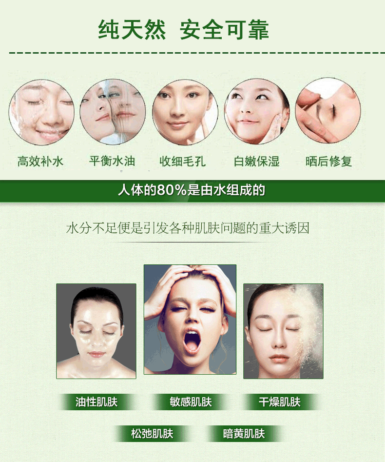 海藻王面膜:富含100%的天然純進(jìn)口極品海藻王,充滿天然優(yōu)質(zhì)豐富的膠原蛋白,用后令肌膚瞬間嫩白水潤,同時可平衡油脂分泌,收細(xì)大毛孔,提高肌膚細(xì)胞的彈性和活力,柔軟清涼的感覺又能舒緩疲勞,放松身心,純天然植物成分又是崇尚天然環(huán)保人士之至愛珍品。
